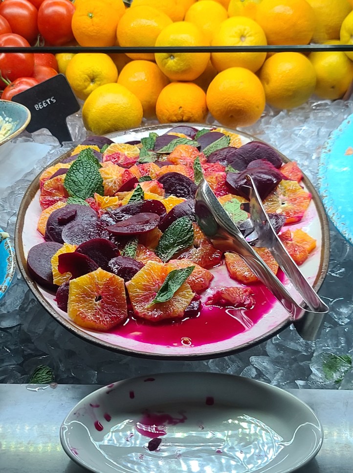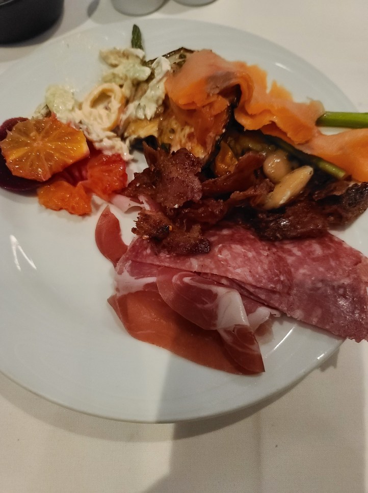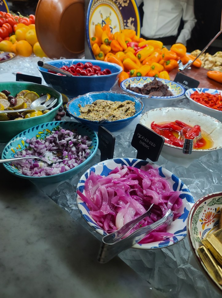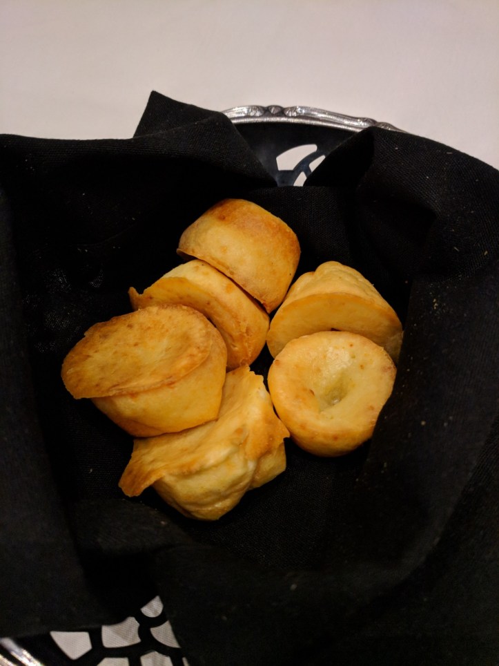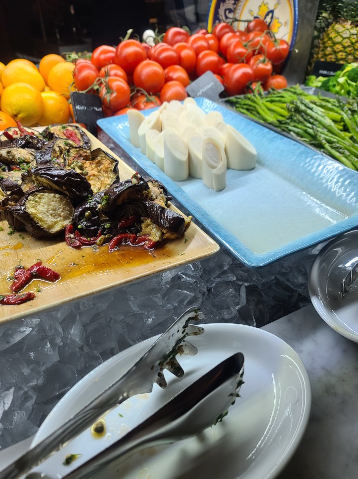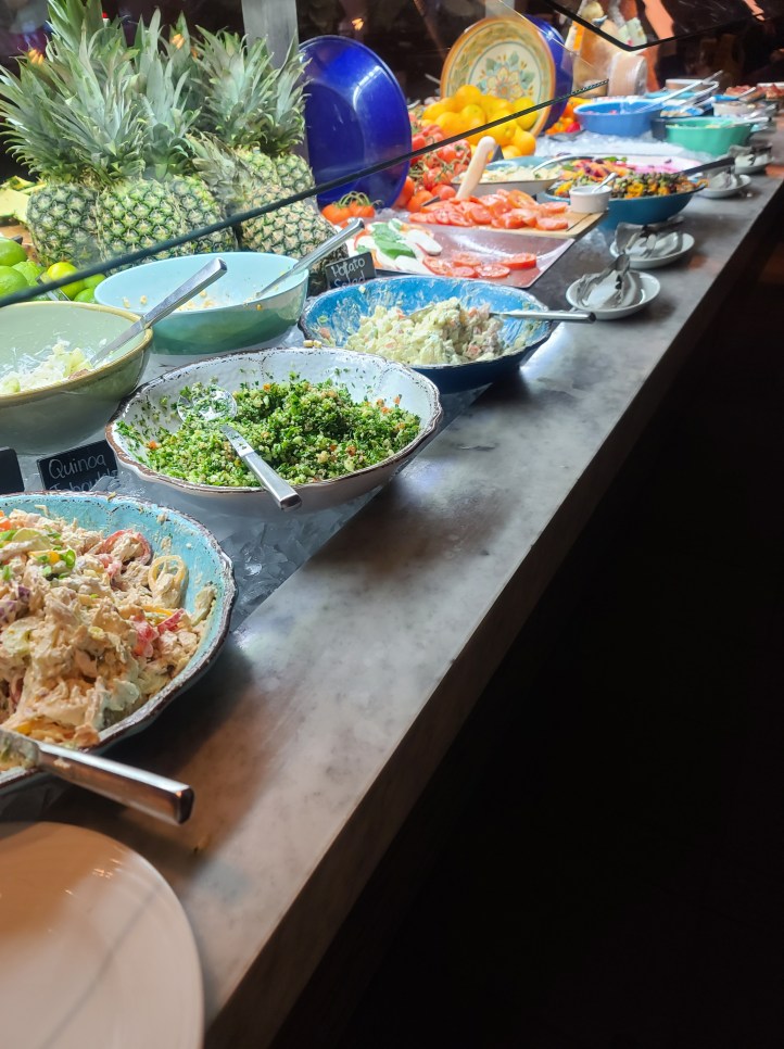 Which is a way of cooking seasoned meats. They have at least 15 selections, so it’s endless possibilities. There is a disk at the table. Red signals you don’t want meat. Green means I want more. Act like Oliver, “Please Sir I Want Some More.” I am showing my age. Don’t pass up the Market Table with fresh fruits, vegetables, and salad (the chicken salad is amazing). Not pictured but the Crispy Pamesan Polenta Fries needs to be mentioned too.