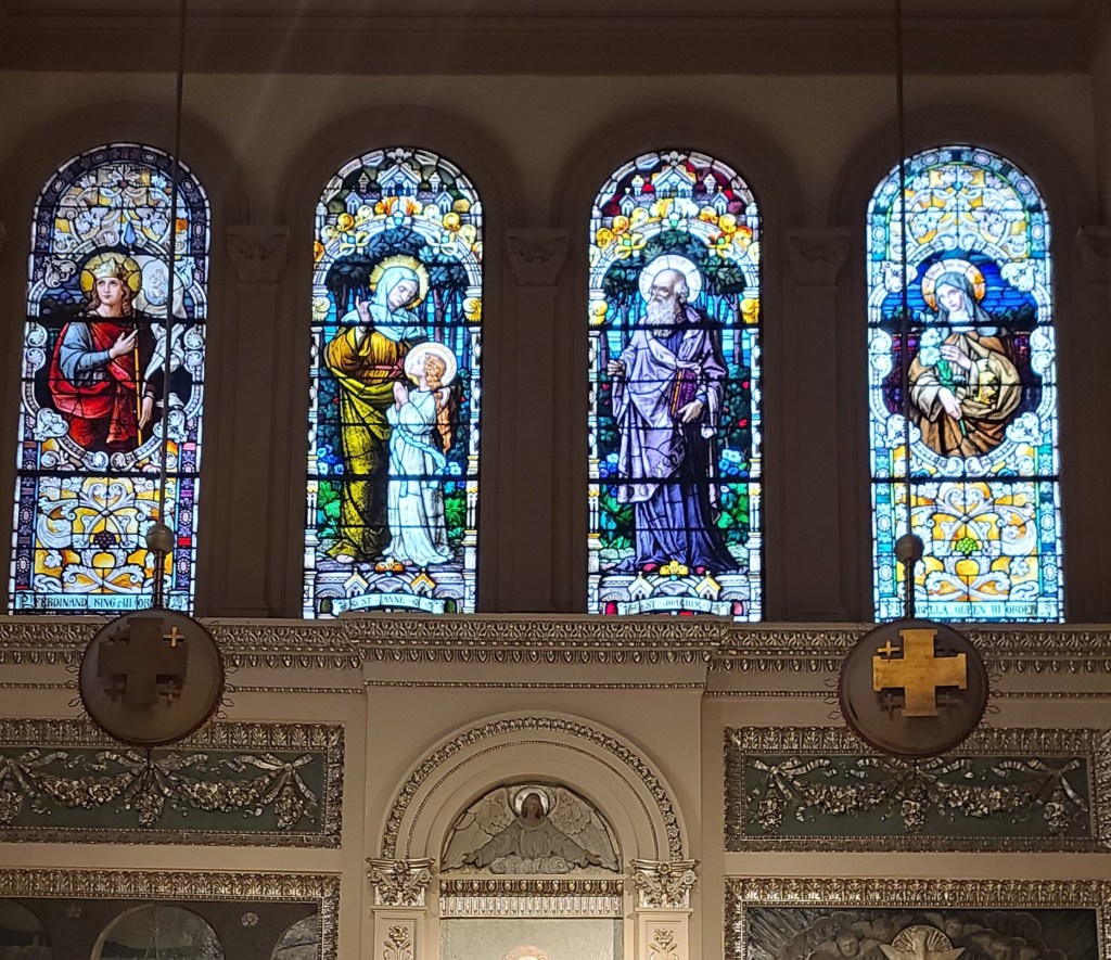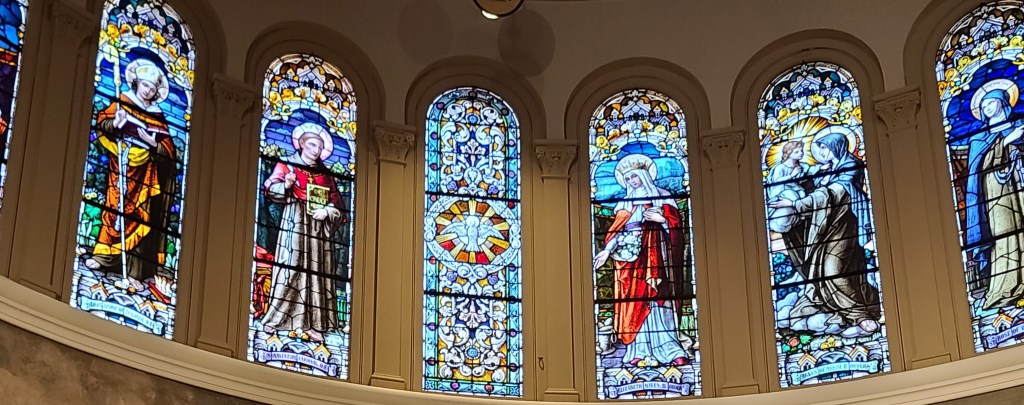 You don’t want to forget to look up at the stained glass windows at the Monastery. Stained glass has been around for thousands of years. Many of the windows tell of events that took place in the Bible or highlight the life of a Saint. Stained glass was a way to tell a story the church wanted people to know. Remember, most people couldn’t read in the earlier centuries. There is a Pliny tale that says, a sailor set their cooking pots on blocks of natron (soda) which is a natural compound of sodium salts used for cooking