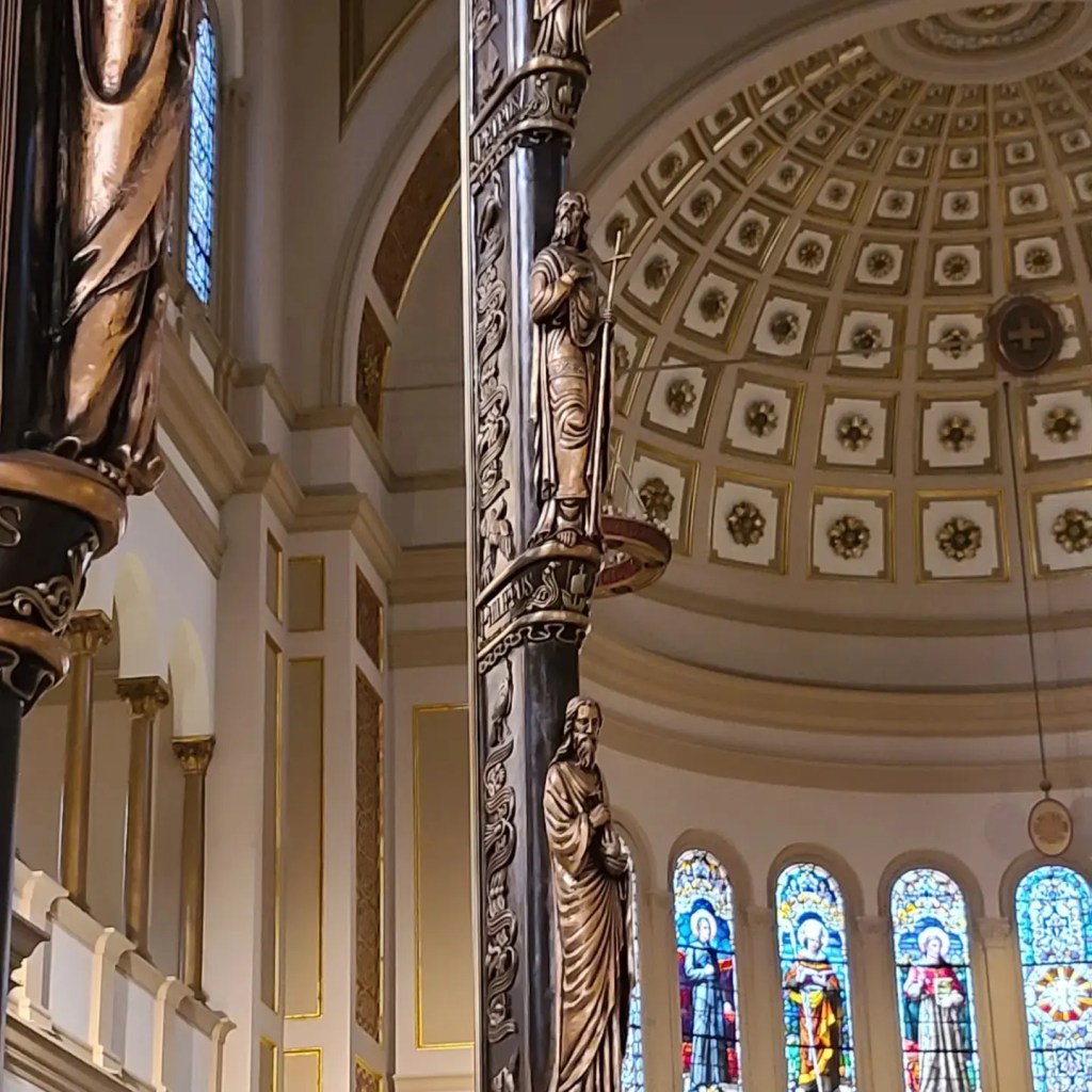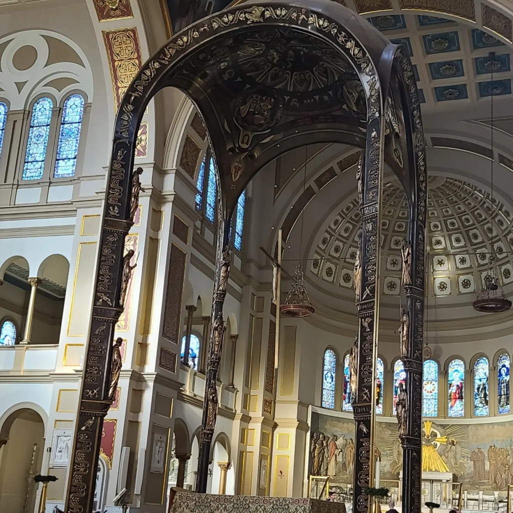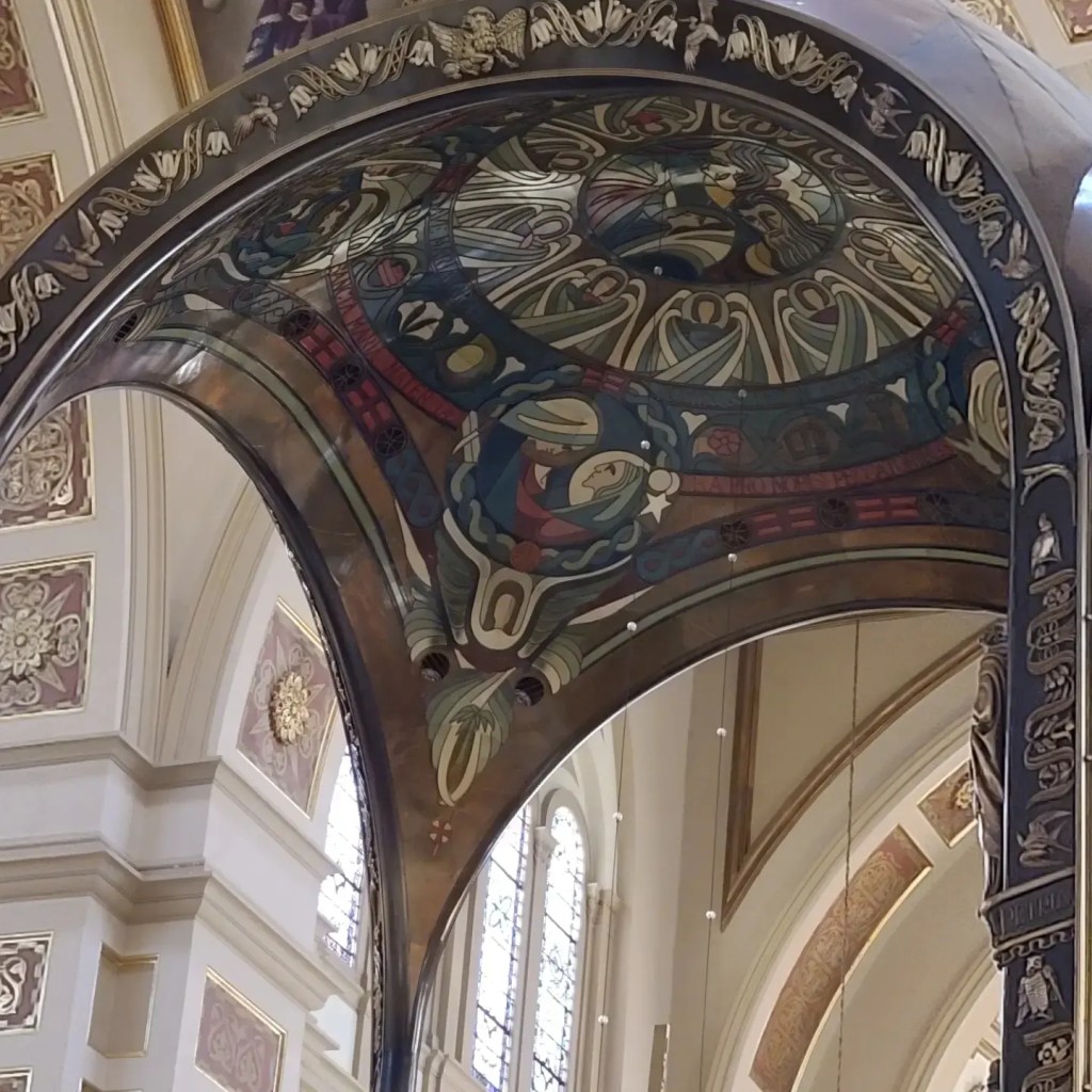 This is the main altar at the Franciscan Monastery, in DC. It has a baldacchino, which is a ceremonial canopy over it. It is made of metal and on the columns you can see birds and flowers, which pay tribute to St. Francis who enjoyed birds. He often had birds follow him around when he walked outside. They would even land on his shoulders and hands when he prayed. On the columns you can also see figures and the names of the 12 apostles.