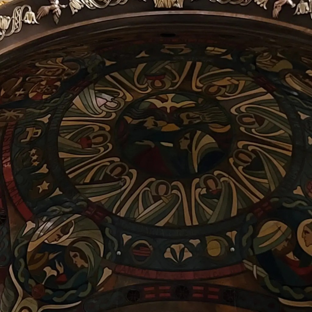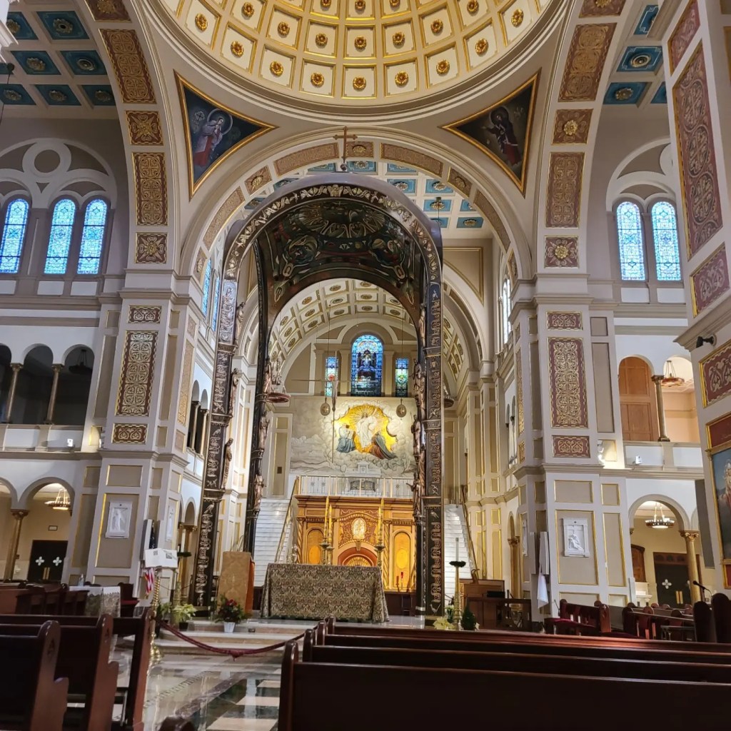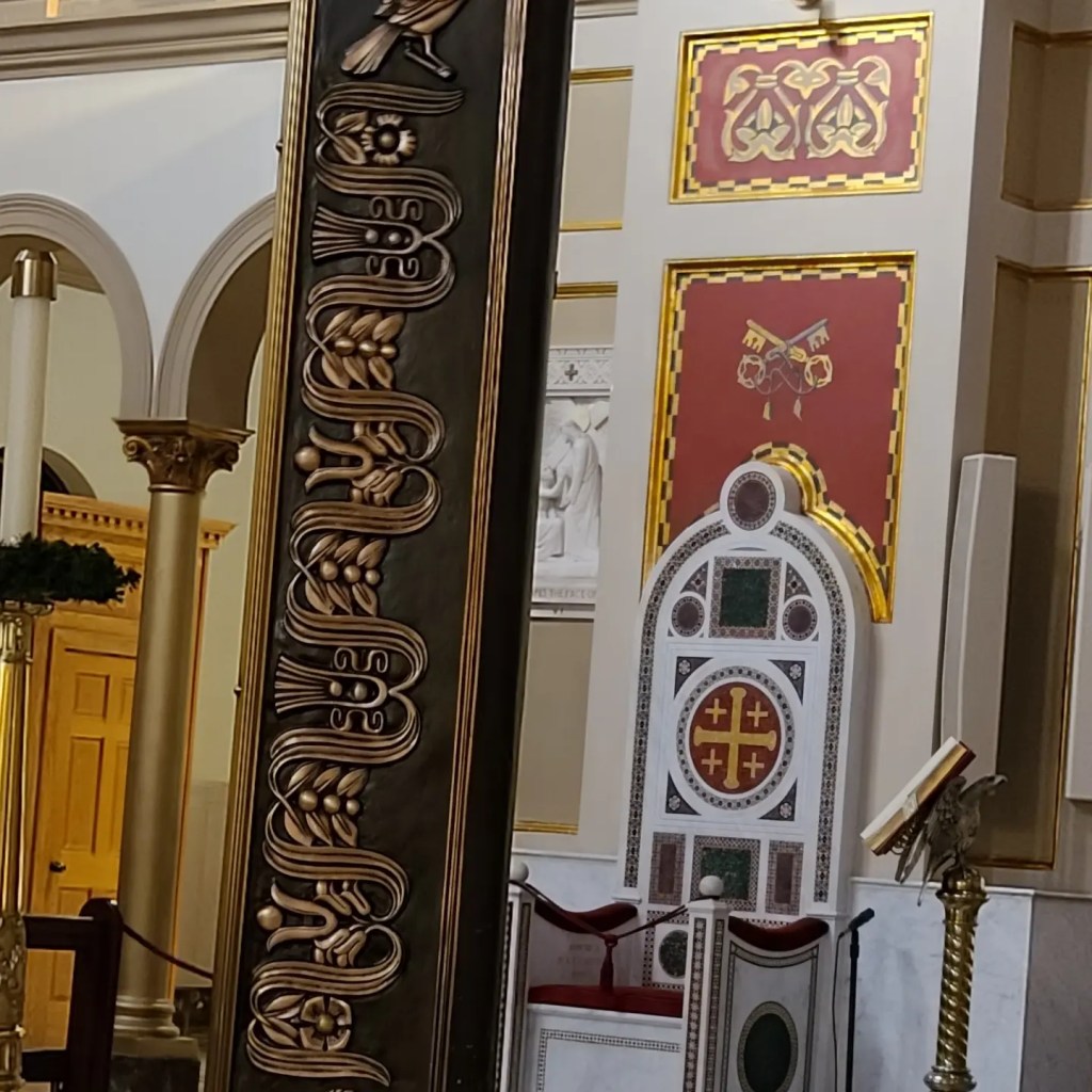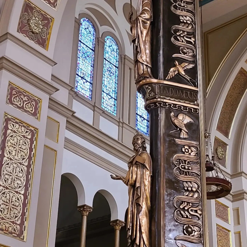 This is the main altar at the Franciscan Monastery, in DC. It has a baldacchino, which is a ceremonial canopy over it. It is made of metal and on the columns you can see birds and flowers, which pay tribute to St. Francis who enjoyed birds. He often had birds follow him around when he walked outside. They would even land on his shoulders and hands when he prayed. On the columns you can also see figures and the names of the 12 apostles.