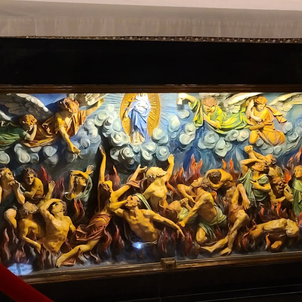 The last best kept secret at the Franciscan Monastery is the catacombs. These catacombs also have 1,000 year old relics that are not replicas but the real thing. One is of a 7 year old martyr St. Innocent. The second is of St. Benignus who is encased in wax. He was a Roman soldier who was decapitated because of his faith. The crypt holds his body but his head is at a church in Italy. There are also other crypts, tombs and a vivid painting on which the artist envisioned what purgatory would look like on the altar in the Purgatory Chapel. I hope you have enjoyed your journey through the Monasteries replicas of the Holy Land in America. It is truly worth seeing up close. So, go take a “Look.”