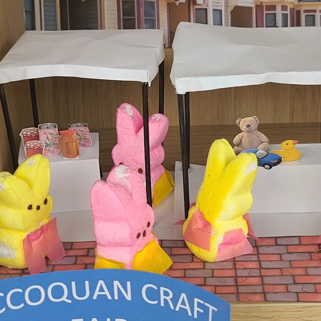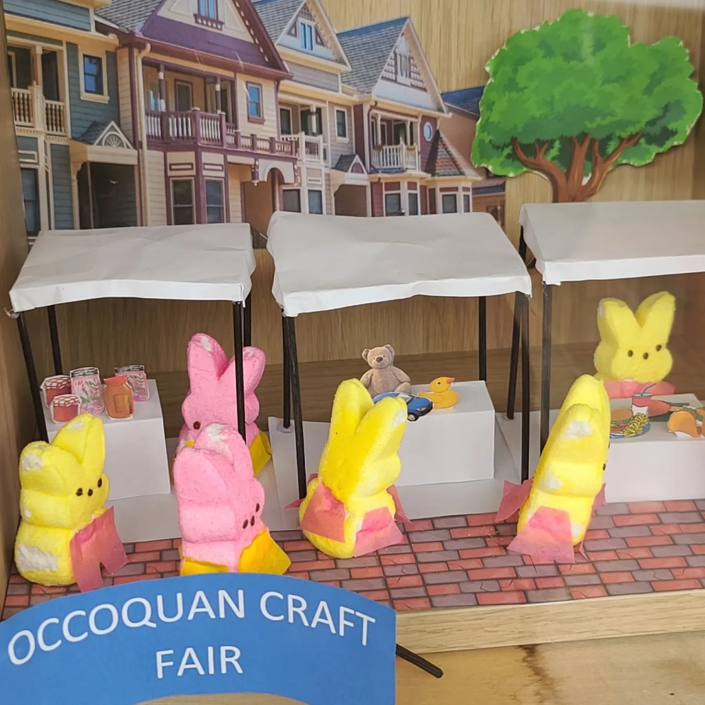 appear on Easter and other holidays. They are called Peeps. These marshmallow confections, made of sugar, corn syrup. gelatin and food dyes are hit too many, but they also make fun action figures. They are made by the Just Born Inc., which was founded by Sam Born, a Russian immigrant (from Ukraine) in 1917. He called his company “Just Born” because he made his marshmallow treats daily. The peep phenomenon has now made them a staple for all holidays. There are even contests that encourage participants to create scenes using the peeps as the focal point. The shop owners in Occoquan, Virginia, hosted a contest. For the next few days, I will share these entries with you. Maybe it will give you some ideas for next year.