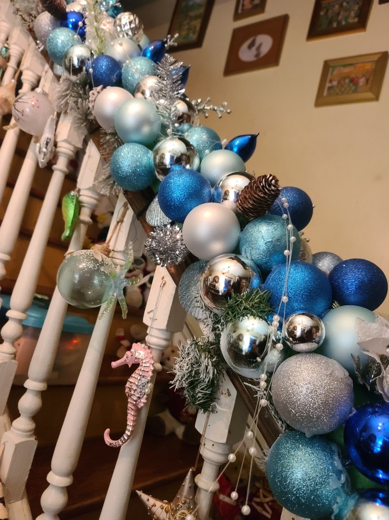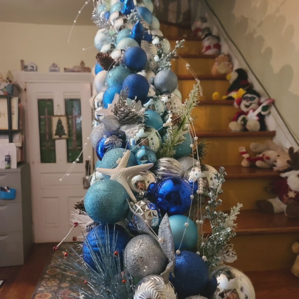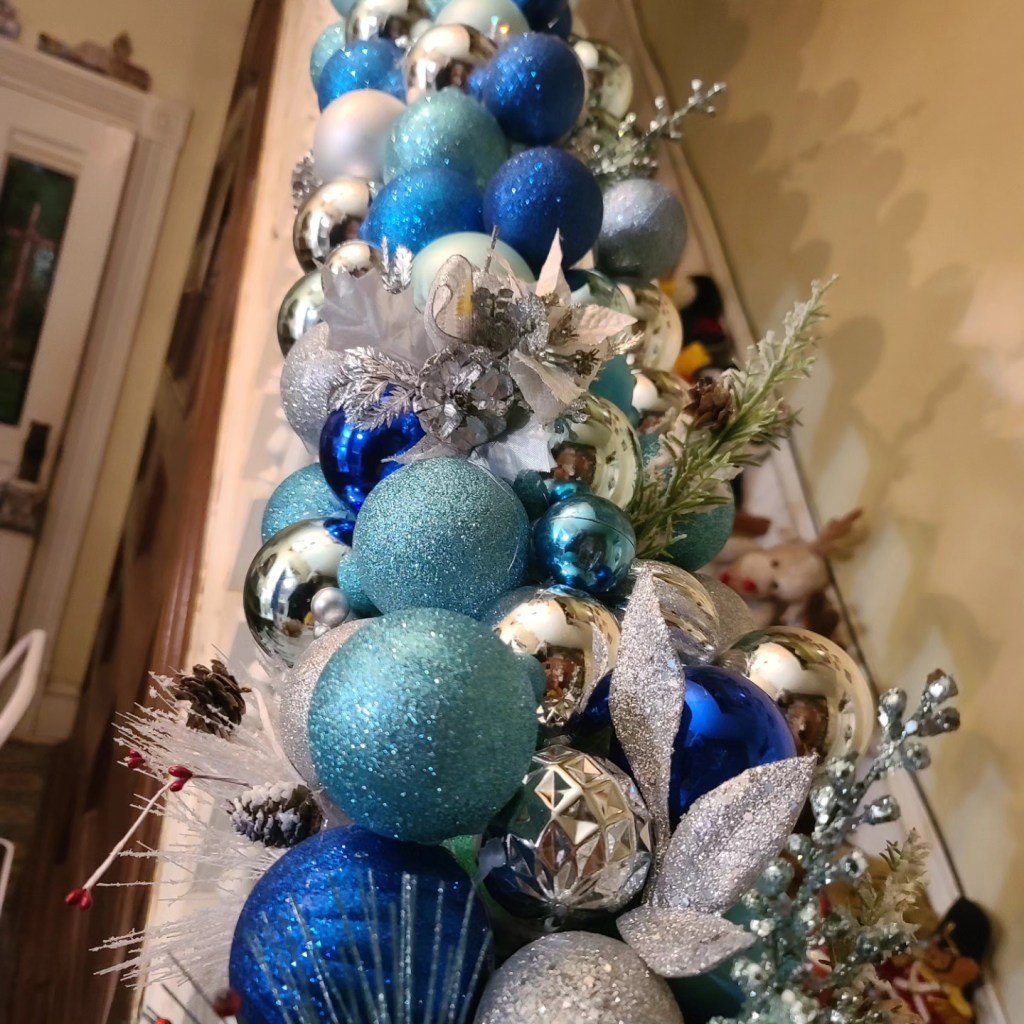 I saw this decorating idea on FB and thought I would give it a try. The balls are hot glued to pool noodles and attached with zip ties. I didn’t realize I have been collecting blue ornaments for years. Thanks hubby for finding them. I love this decoration. Once the season is over I can cut the zip ties and save the noodles with ornaments for next year. I will let you know if it works. This is my favorite time of year. Try letting your creativity shine.