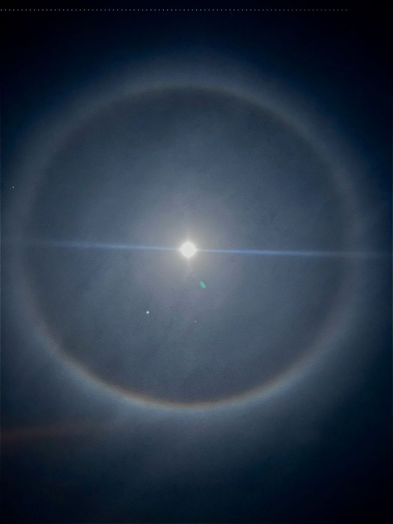Hubby says: “When it is cold outside, sometimes the moon will have a halo around it. This striking and often beautiful halo around the moon is caused by the refraction of moonlight from ice crystals in the upper atmosphere. ” I just think it’s beautiful. Go take a look up at the moon.