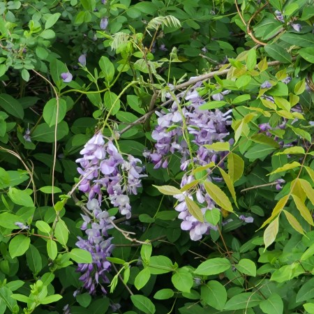 Day 220 Stop and Look 365   I think this looks magical. Some call it an invasive weed. It’s  wisteria. I guess too much of something can be overwhelming. But, how can you ignore the delicacy of these tiny lilac color flowers?Yes, it has taken over these trees. But, these flowers are providing food for the pollinators (the bees). They need our help. The sound resonating is like a lullaby, humming you to sleep. This place is stimulating for my imagination.  I am being transformed into a world of wonder and dreams. I think we need to leave nature alone. Not always try to control it. Admire the beauty it shares with us. Before, we lose it.